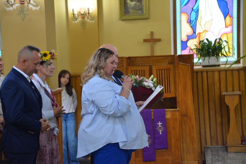 Msza rozpoczęła się uroczystym wniesieniem wieńca dożynkowego do kościoła przez naszych gospodarzy. Na zakończenie liturgii wszyscy mogli podzielić się chlebem wypieczonym z tegorocznych zbóż – zgodnie z piękną polską tradycją.