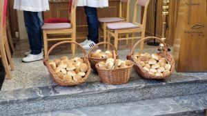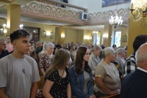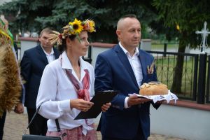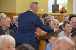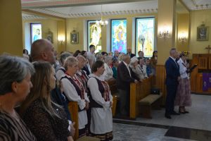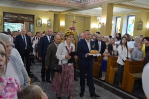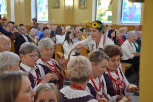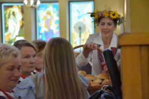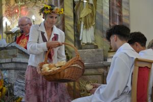 Msza rozpoczęła się uroczystym wniesieniem wieńca dożynkowego do kościoła przez naszych gospodarzy. Na zakończenie liturgii wszyscy mogli podzielić się chlebem wypieczonym z tegorocznych zbóż – zgodnie z piękną polską tradycją.